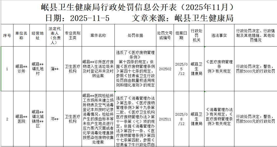 岷县卫生健康局行政处罚信息公开表(2025年11月)