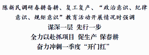 2月28日上午,县委书记陈新民先后深入茶埠镇、梅川镇调研春耕备耕、复工复产、“政治意识、纪律意识、规矩意识”教育活动开展情况。他强调,要深入学习贯彻习近平总书记关于“三农”工作的重要论述,全面落实中央一号文件精神,谋深一层、先行一步,全力以赴抓项目、促生产、保春耕,奋力冲刺一季度“开门红”。